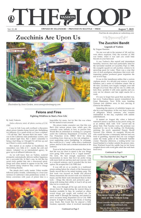 A new Vashon legend… felons fighting fires… and even zucchinis. All on the front page! Coverage of a Seattle grunge icon, Seán and John and a bicycle (don’t miss the wooden wheels). How to invest—in yourself. Stress detection and management. Horoscopes, puzzles, and lots more.